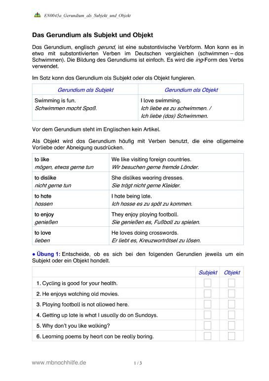 Laden Sie unsere kostenlosen Arbeitsblätter für die 8. Klasse herunter und üben Sie den Gebrauch von Infinitiv und Gerundium im Englischen. Perfekt für Schüler und Lehrer, inklusive PDF-Format.