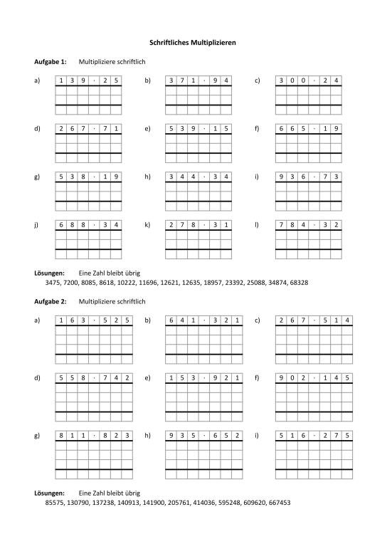 Arbeitsblatt Schriftliche Multiplikation – Drucken, PDF